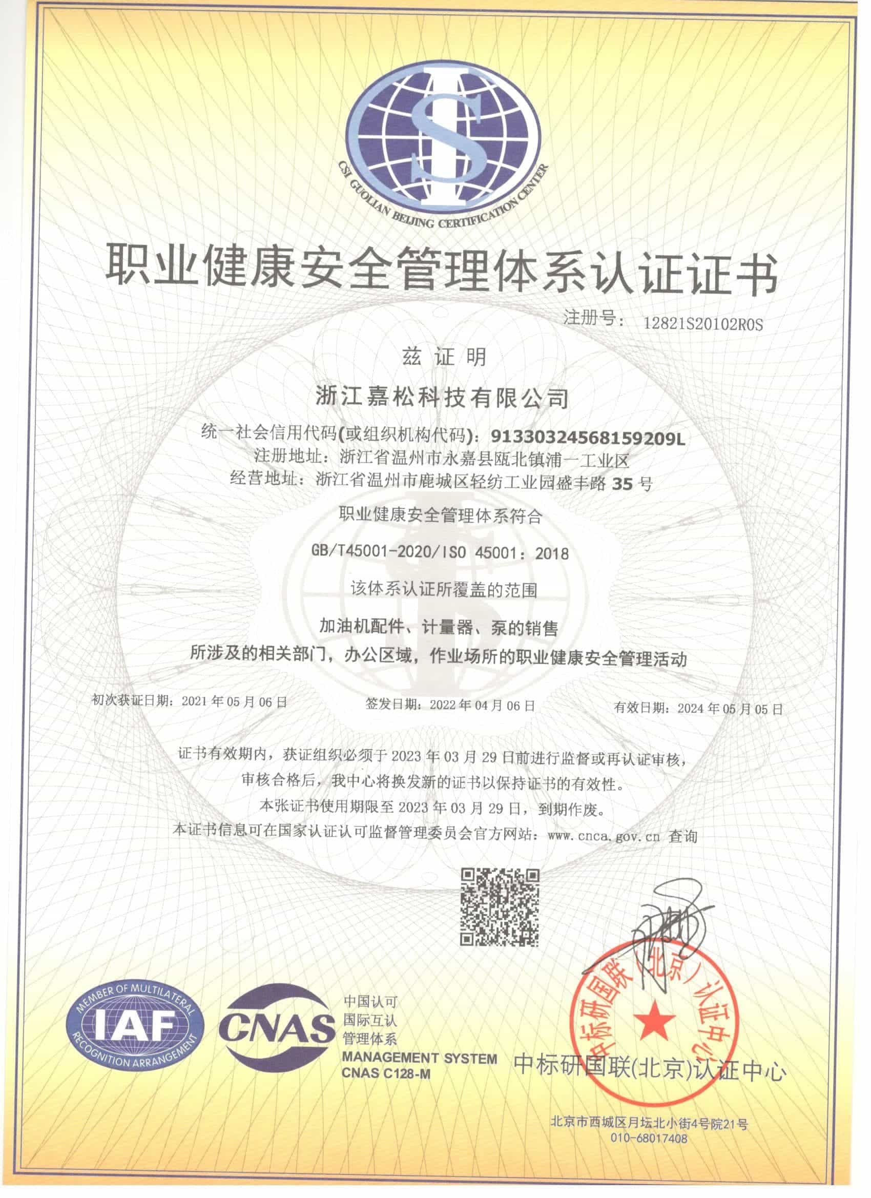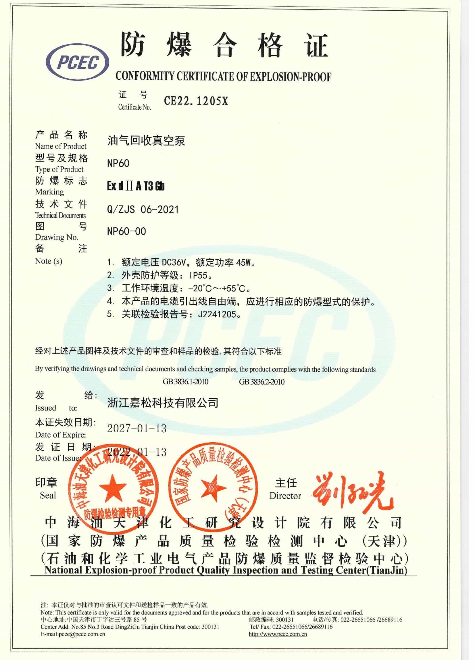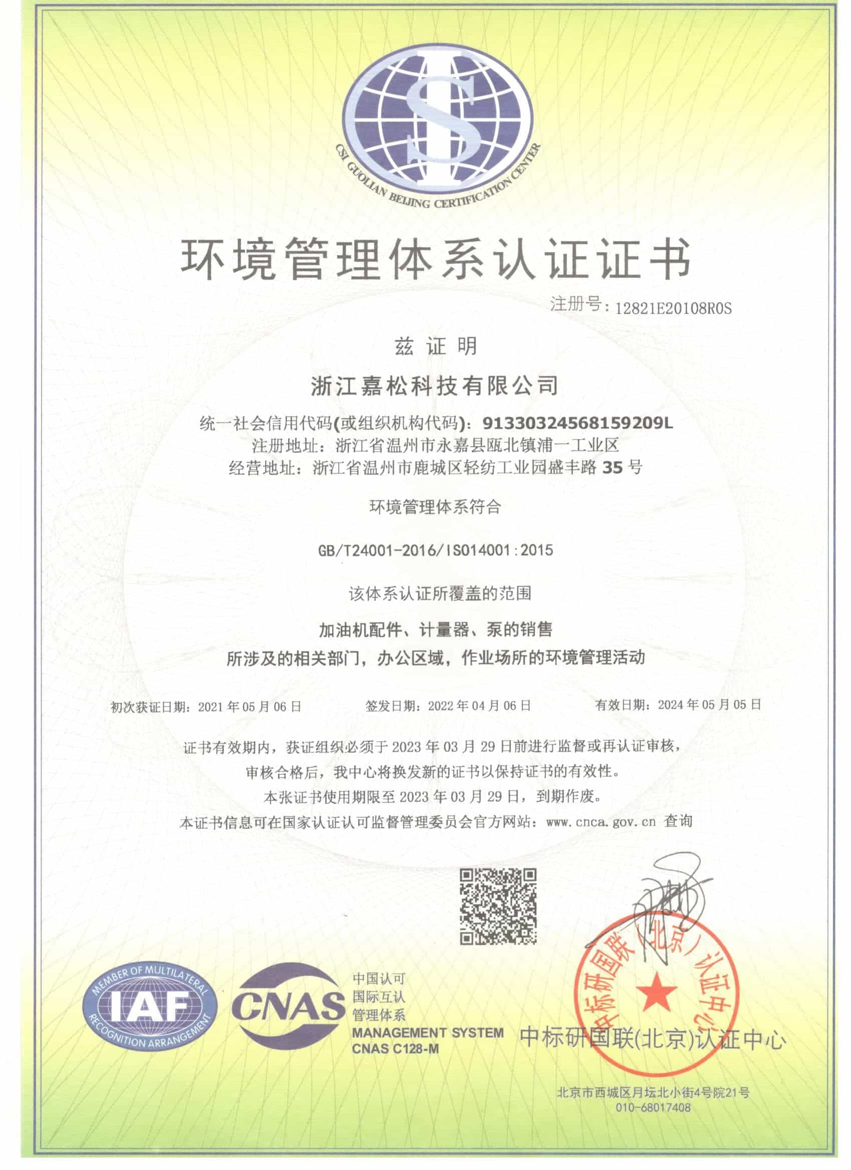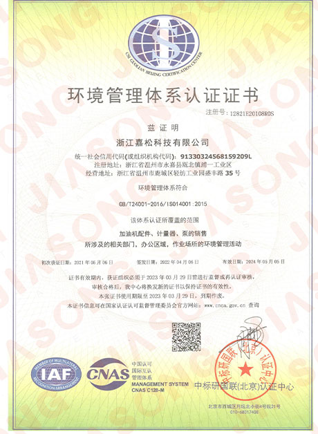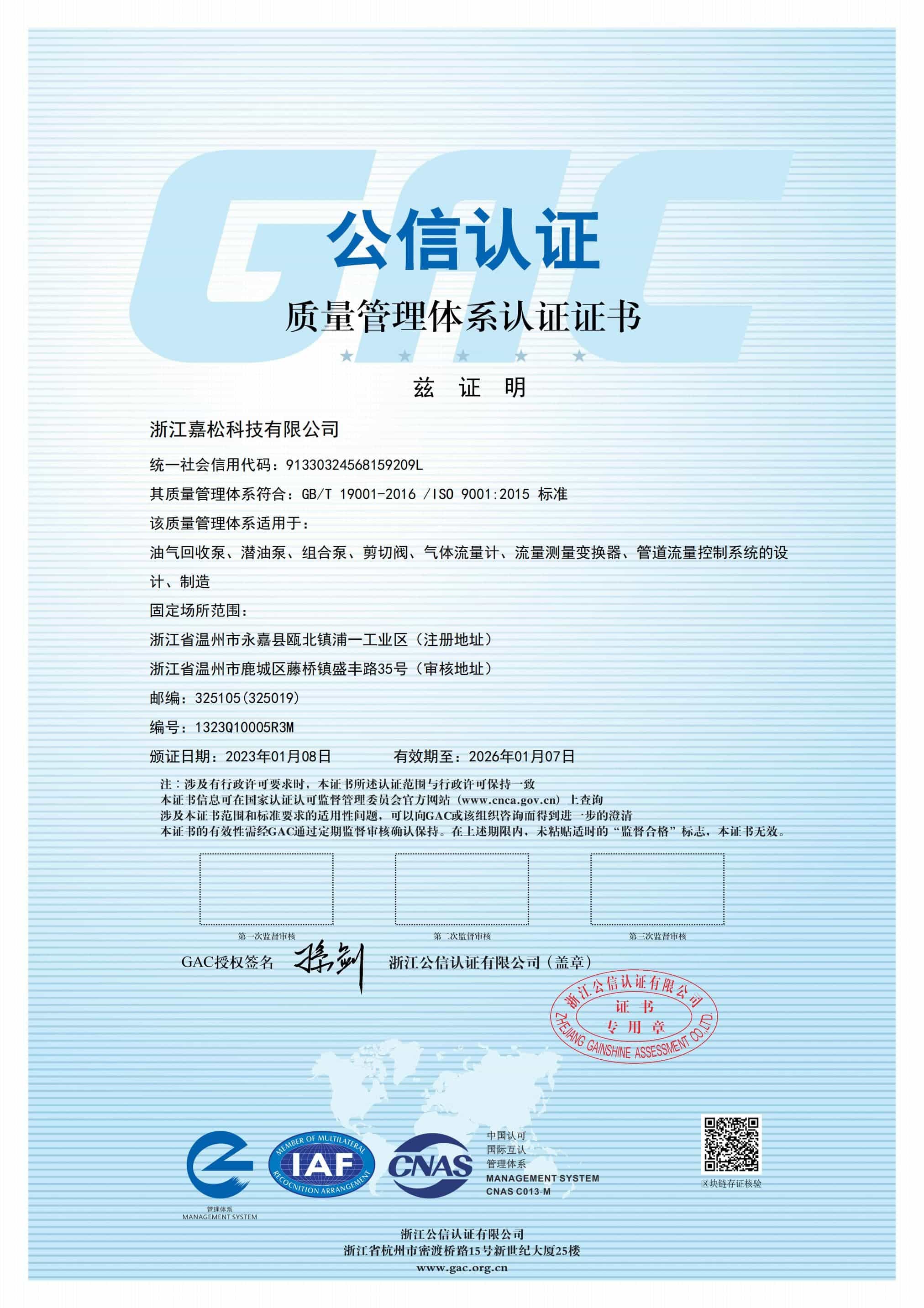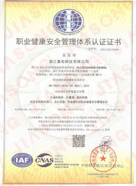 浙江嘉松科(kē)技(jì )有(yǒu)限公(gōng)司主要产(chǎn)品包含:加油机用(yòng)泵和流量计,潜油泵、工(gōng)业用(yòng)大流量泵和流量计,油气回收系列、LPG加气机部件系列、尿素DEF系列、加油机等其他(tā)部件系列。 公(gōng)司拥有(yǒu)完善的ISO9001管理(lǐ)體(tǐ)系、欧盟ATEX认证、UL、防爆产(chǎn)品3C证书等一系列认证。
